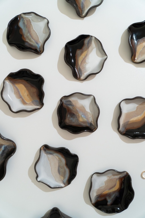 The shape, inspired by oyster shells and the movement of waves, recalls a fragment of the seabed shaped by water and sand. Its irregular outline and soft edges make each bowl appear as if lifted from the ocean depths.